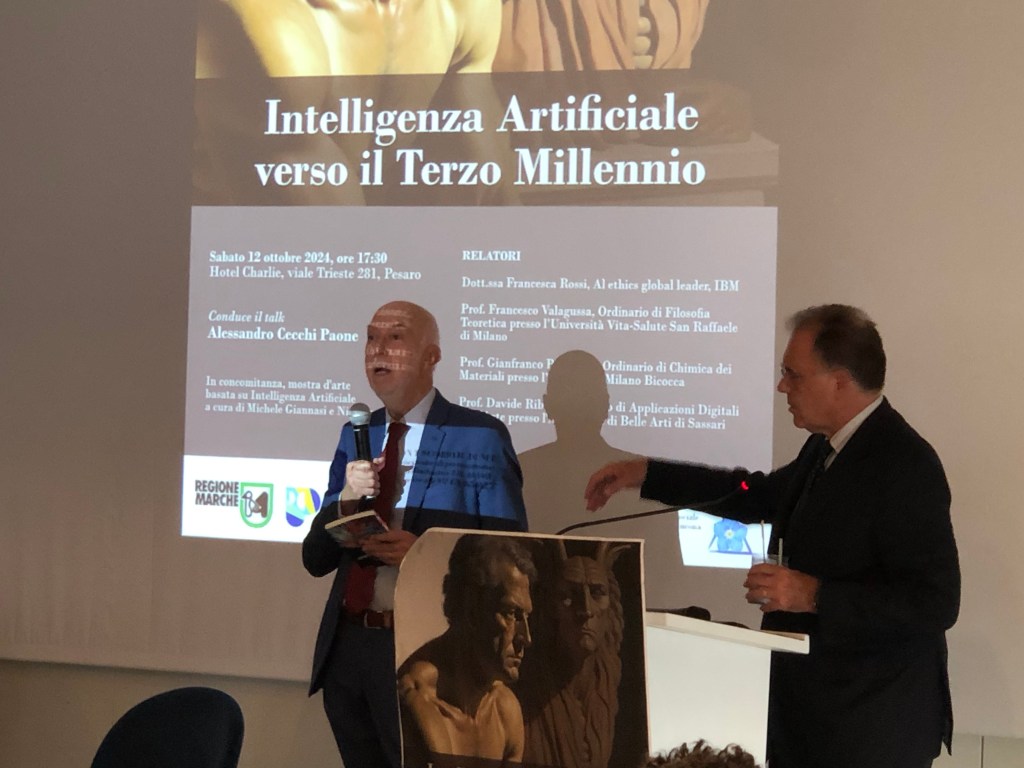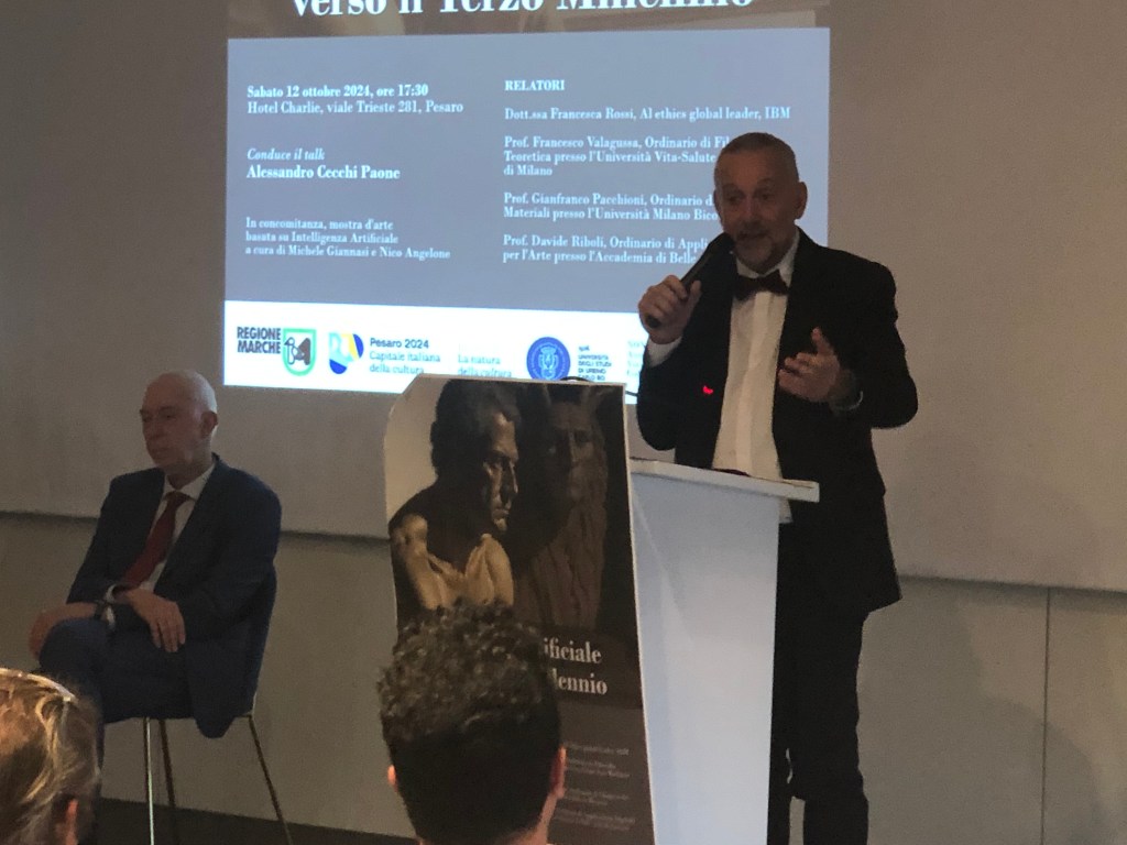 L’organizzazione della serata è stata impeccabile grazie al lavoro di Luciano Roberti, Almerindo Duranti e Giovanni Pelonghini, tutti membri della APS Non ti Scordar di Me. Hanno garantito un’accoglienza perfetta per i partecipanti e una gestione senza problemi di ogni aspetto dell’evento, dalla logistica all’accoglienza, fino alla gestione tecnica degli interventi. La qualità dell’organizzazione ha contribuito in modo determinante al successo dell’evento, permettendo ai relatori di concentrarsi esclusivamente sui loro interventi e al pubblico di godere pienamente della serata. Il congresso è stato inserito nel programma ufficiale di “Pesaro Capitale Italiana della Cultura 2024” e ha ricevuto il patrocinio della Regione Marche, del Comune di Pesaro e dell’Università degli Studi di Urbino. Questa inclusione ha dato ulteriore prestigio all’evento, evidenziando l’importanza della discussione sui temi legati all’intelligenza artificiale per la cultura e la società contemporanea.